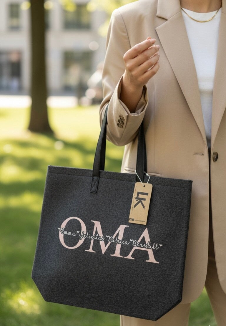 Graue Tasche OMA(weiß) und Kindernamen (Braun)